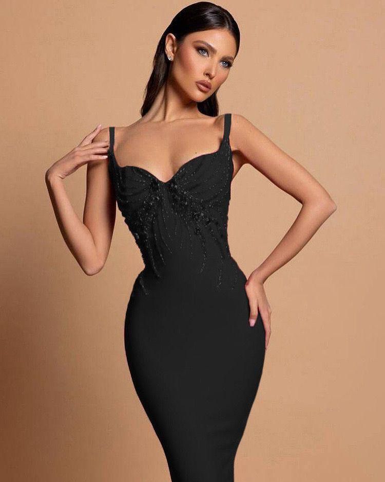 This black dress features intricate beaded detailing and thin spaghetti straps for a sleek, glamorous look.